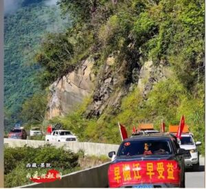 One of the earliest manifestations of the mega project getting under way was the footage of Tibetan and Monpa villagers being driven out, in convoy, to take up a new life on the frontier, no longer farming or raising livestock, dependent on government transfer payments. The tray trucks carrying them into modernity with Chinese characteristics are festooned with big character banners proclaiming their gratitude at being dispossessed. The message: “grateful for relocation, embracing new life” and “move early, benefit early,” 尽早行动,尽早获益, official slogans that present the displaced as smart early adopters, to be copied.